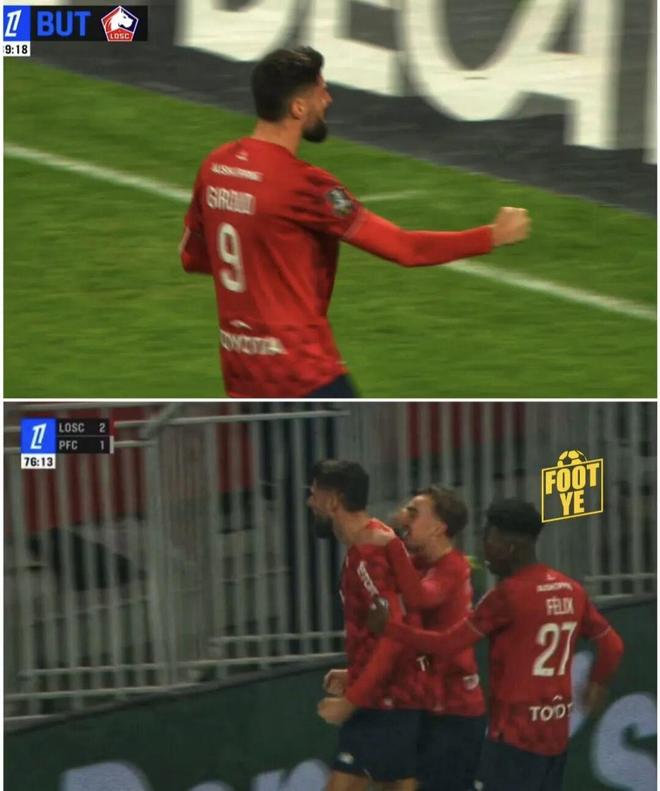 法甲第13轮比赛,吉鲁上演梅开二度,帮助里尔主场4-2击败巴黎FC。