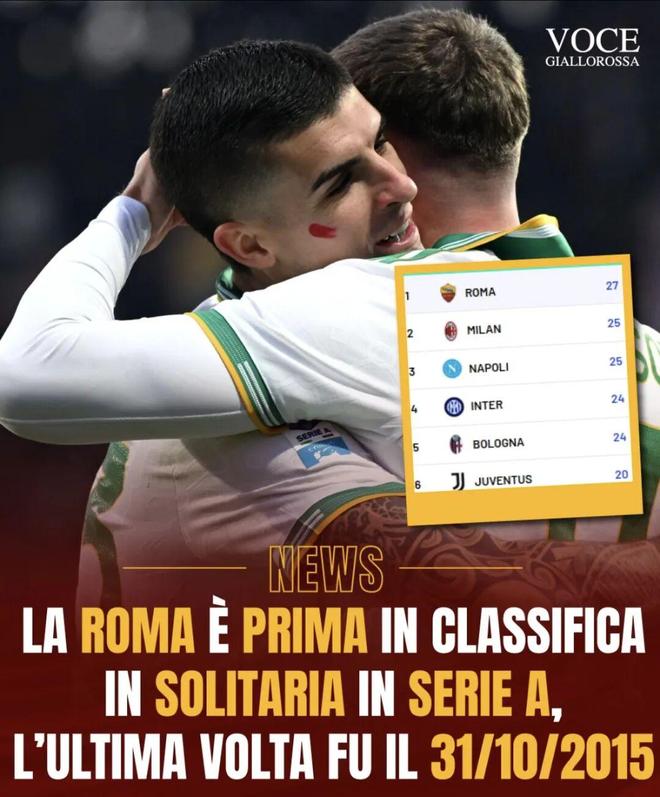 目前,罗马队以27分在意甲领跑,领先米兰和那不勒斯2分。而罗马上一次独自成为意甲领头羊还是在2015年10月31日,距今已经3676天。